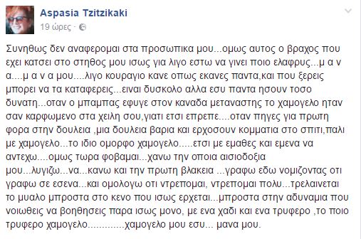 Δύσκολες ώρες περνά η Ασπασία Τζιτζικάκη. Η γνωστή ηθοποιός έγραψε ένα συγκινητικό μήνυμα στο Facebook για την μητέρα της που απ’ ότι φαίνεται δίνει μάχη να κρατηθεί στη ζωή.