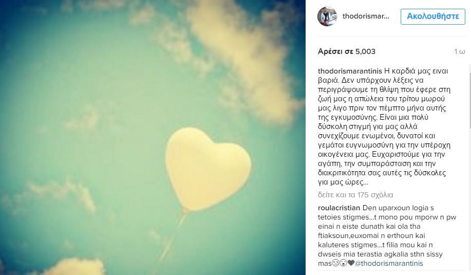 Όπως έγραψε ο ίδιος ο Θοδωρής Μαραντίνηςστο Instagram, η Σίσυ Χρηστίδου απέβαλε λίγο πριν τον 5ο μήνα της εγκυμοσύνης.