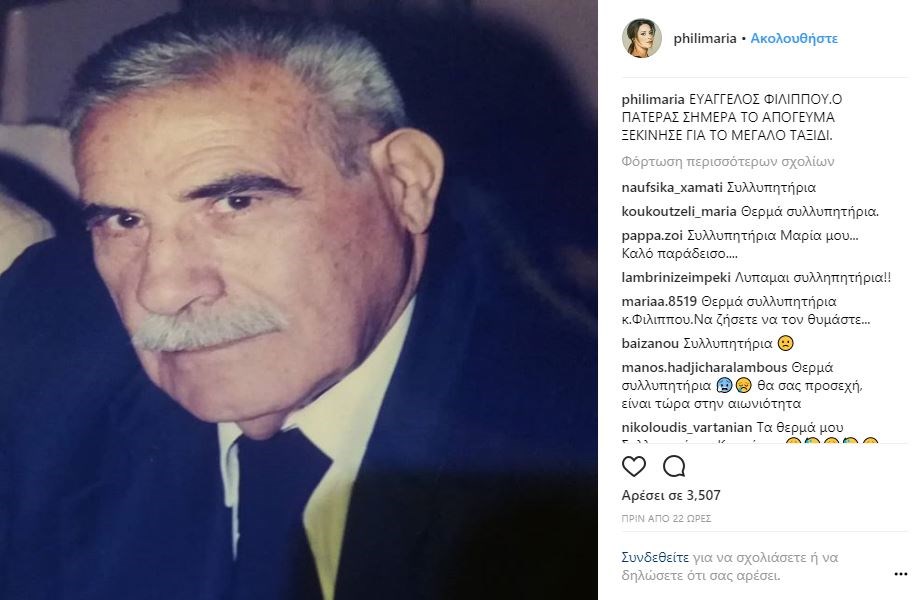 Μία από τις πιο δύσκολες στιγμές της ζωής της περνά γνωστή ηθοποιός, η οποία πρωταγωνιστεί στη σειρά «Έλα στη θέση μου».Πρόκειται για τη δημοφιλή ηθοποιό, Μαρία Φιλίππου, η οποία με ένα συγκινητικό της μήνυμα και έντονα φορτισμένη συναισθηματικά, γνωστοποίησε την είδηση της απώλειας του αγαπημένου της πατέρα μέσω του προσωπικού της λογαριασμού στο Instagram.Η Μαρία Φιλίππου αναρτώντας μία φωτογραφία του πατέρα της, Ευάγγελου έγραψε: «Ευάγγελος Φιλίππου. Ο πατέρας σήμερα το απόγευμα ξεκίνησε για το μεγάλο ταξίδι».Πολλά ήταν τα μηνύματα που έλαβε από διαδικτυακούς της φίλους που έσπευσαν να τη συλλυπηθούν για την απώλεια.Αργότερα η Μαρία Φιλίππου ανήρτησε κι άλλη φωτογραφία της ίδιας μαζί με τον πατέρα της.