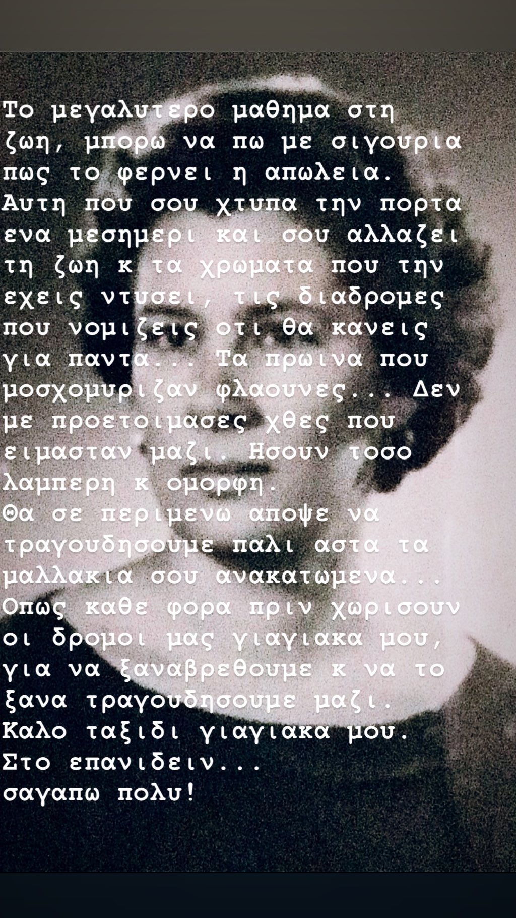“Το μεγαλύτερο μάθημα στη ζωή, μπορώ να πω με σιγουριά πως το φέρνει η απώλεια. Αυτή που σου χτυπά την πόρτα ένα μεσημέρι και σου αλλάζει τη ζωή και τα χρώματα, που την έχεις ντύσει, τις διαδρομές που νομίζεις ότι θα κάνεις για πάντα…Τα πρωινά που μύριζαν φλάουνες…Δεν με προετοίμασες χθες που ήμασταν μαζί. Ήσουν τόσο λαμπερή και όμορφη. Θα σε περιμένω απόψε να τραγουδήσουμε πάλι άστα τα μαλλάκια σου ανακατωμένα… Όπως κάθε φορά πριν χωρίσουν οι δρόμοι μας γιαγιάκα μου, για να ξαναβρεθούμε και να το ξανατραγουδήσουμε μαζί. Καλό ταξίδι γιαγιάκα μου. Στο επανιδείν… Σ’ αγαπώ πολύ”, έγραψε χαρακτηριστικά η Μαριάντα Πιερίδη.