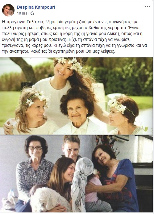 “Η προγιαγιά Γαλάτεια, έζησε μία γεμάτη ζωή με έντονες συγκινήσεις, με πολλή αγάπη και φοβερές εμπειρίες μέχρι τα βαθιά της γεράματα. Έγινε πολύ νωρίς μητέρα, όπως και η κόρη της (η γιαγιά μου Αλίκη), όπως και η εγγονή της (η μαμά μου Χριστίνα). Είχε τη σπάνια τύχη να γνωρίσει τρισέγγονα, τις κόρες μου. Κι εγώ είχα τη σπάνια τύχη να τη γνωρίσω και να την αγαπήσω. Καλό ταξίδι αγαπημένη μου! Θα μας λείψεις”.