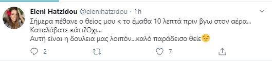 Συγκεκριμένα, έγραψε: «Σήμερα πέθανε ο θείος μου και το έμαθα 10 λεπτά πριν βγω στον αέρα… Καταλάβατε κάτι; Όχι… Αυτή είναι η δουλειά μας λοιπόν. Καλό παράδεισο θείε».