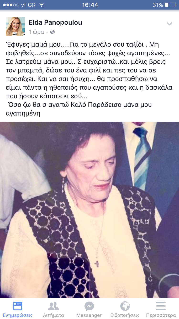 «Έφυγες μαμά μου για το μεγάλο σου ταξίδι. Μη φοβηθείς… σε συνοδεύουν τόσες ψυχές αγαπημένες… Σε λατρεύω μάνα μου! Σ’ ευχαριστώ… Και μόλις βρεις τον μπαμπά, δώσε του ένα φιλί και πες του να σε προσέχει. Και να ‘σαι ήσυχη… θα προσπαθήσω να είμαι πάντα η ηθοποιός που αγαπούσες και η δασκάλα που ήσουν κάποτε κι εσύ. Όσο ζω θα σ αγαπώ. Καλό παράδεισο μάνα μου αγαπημένη!», έγραψε η ηθοποιός στη σελίδα της στο Faceboοk, δημοσιεύοντας φωτογραφία της μητέρας της.