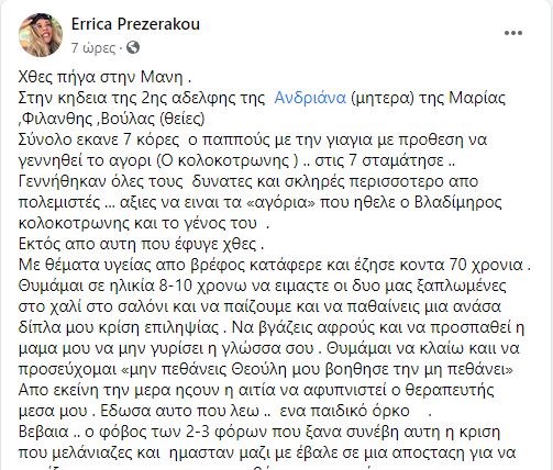 Συγκεκριμένα η Έρρικα Πρεζεράκου αναφέρει: “Χθες πήγα στην Μάνη. Στην κηδεία της 2ης αδελφής της Ανδριάνα (μητέρα) της Μαρίας ,Φιλανθης ,Βούλας (θείες). Σύνολο έκανε 7 κόρες ο παππούς με την γιαγιά με πρόθεση να γεννηθεί το αγόρι (Ο Κολοκοτρώνης ) .. στις 7 σταμάτησε .. Γεννήθηκαν όλες τους δυνατές και σκληρές περισσότερο από πολεμιστές … άξιες να είναι τα «αγόρια» που ήθελε ο Βλαδίμηρος Κολοκοτρώνης και το γένος του. Εκτός από αυτή που έφυγε χθες . Με θέματα υγείας από βρέφος κατάφερε και έζησε κοντά 70 χρόνια. Θυμάμαι σε ηλικία 8-10 χρόνων να είμαστε οι δυο μας ξαπλωμένες στο χαλί στο σαλόνι και να παίζουμε και να παθαίνεις μια ανάσα δίπλα μου κρίση επιληψίας . Να βγάζεις αφρούς και να προσπαθεί η μαμά μου να μην γυρίσει η γλώσσα σου. Θυμάμαι να κλαίω και να προσεύχομαι «μην πεθάνεις Θεούλη μου βοήθησε την μη πεθάνει» Από εκείνη την μέρα ήσουν η αιτία να αφυπνιστεί ο θεραπευτής μέσα μου . Έδωσα αυτό που λέω .. ένα παιδικό όρκο . Βεβαία .. ο φόβος των 2-3 φόρων που ξανά συνέβη αυτή η κρίση που μελάνιαζες και ήμασταν μαζί με έβαλε σε μια απόσταση για να αντέξω .. το τόσο κοντά με τον θάνατο και το άγνωστο της ασθένειας σου. Μεγαλώνοντας συνειδητοποίησα ότι σε κάθε οικογενειακό σύστημα υπάρχει μια πρόκληση .. ο καθένας την βιώνει διαφορετικά .. Δεν υπάρχει σωστό η λάθος στο πως η κάθε ψυχή αποφασίζει να ζήσει η πότε αποφασίζει να απελευθερωθεί .. είμαστε εμείς οι γύρω που έχουμε τα πιο δυνατά μαθήματα να πάρουμε .. Καλό ταξίδι Αγγελική .. Θα είσαι πάντα ένα ιδιαίτερο συμβόλαιο μέσα στην ψυχή μας”.