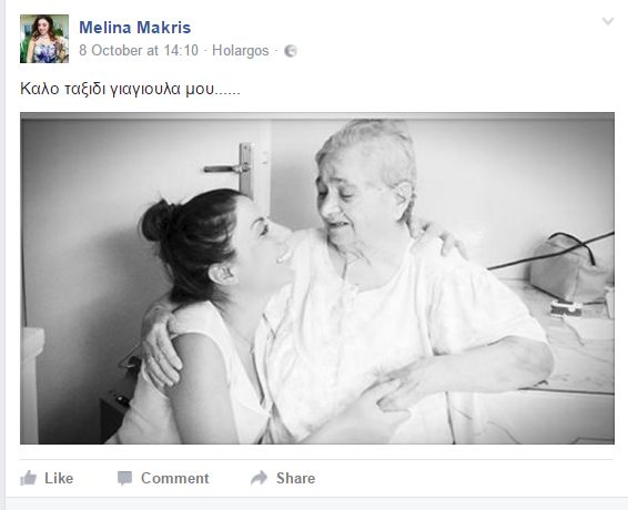 Η Μελίνα μοιράστηκε την δυσάρεστη είδηση με τους φίλους της στο facebook ανεβάζοντας την παραπάνω συγκινητική φωτογραφία και γράφοντας το εξής μήνυμα: «Καλό ταξίδι γιαγιούλα μου».
