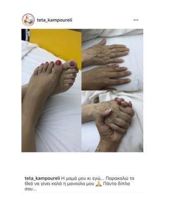 Συγκεκριμένα, δημοσίευσε μία φωτογραφία, όπου κρατάει το χέρι της μητέρας της και έγραψε χαρακτηριστικά: «Η μαμά μου κι εγώ… Παρακαλώ το Θεό να γίνει καλά η μανούλα μου. Πάντα δίπλα σου…».