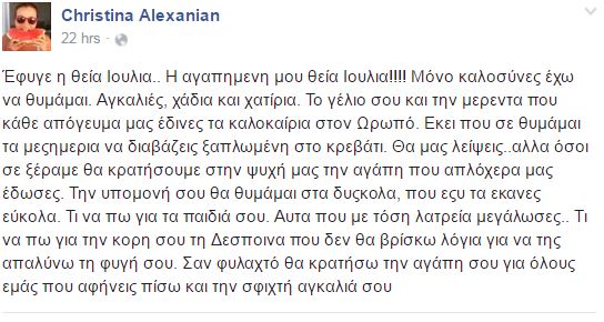 «Έφυγε η θεία Ιουλία.. Η αγαπημένη μου θεία Ιουλία!!!! Μόνο καλοσύνες έχω να θυμάμαι. Αγκαλιές, χάδια και χατίρια. Το γέλιο σου και την μερέντα που κάθε απόγευμα μας έδινες τα καλοκαίρια στον Ωρωπό. Εκεί που σε θυμάμαι τα μεσημέρια να διαβάζεις ξαπλωμένη στο κρεβάτι. Θα μας λείψεις.. αλλά όσοι σε ξέραμε θα κρατήσουμε στην ψυχή μας την αγάπη που απλόχερα μας έδωσες. Την υπομονή σου θα θυμάμαι στα δύσκολα, που εσύ τα έκανες εύκολα. Τι να πω για τα παιδιά σου. Αυτά που με τόση λατρεία μεγάλωσες. Τι να πω για την κόρη σου τη Δέσποινα που δεν θα βρίσκω λόγια για να της απαλύνω τη φυγή σου. Σαν φυλαχτό θα κρατήσω την αγάπη σου για όλους εμάς που αφήνεις πίσω και την σφιχτή αγκαλιά σου», έγραψε η Χριστίνα Αλεξανιάν, που θέλησε να μοιραστεί τις δύσκολες ώρες που βιώνει αυτό το διάστημα με τους διαδικτυακούς της φίλους.