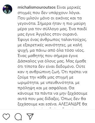 Ένας μαθητής που σήμερα έγινε Δάσκαλος για όλους μας. Μας έμαθε ότι τίποτα δεν είναι δεδομένο. Ούτε καν η ανθρώπινη ζωή. Ότι πρέπει να ζούμε την κάθε μας στιγμή με ωριμότητα, με υπευθυνότητα, με πρόληψη και με ασφάλεια. Θα κάνουμε τα πάντα να μην ξεχάσουμε αυτά που μας δίδαξες. Όπως δεν θα ξεχάσουμε και εσένα. ΑΛΕΞΑΝΔΡΕ θα σε αγαπάμε όσο ζούμε. Για πάντα στις καρδιές μας. Για πάντα Raou Team. Καλό ταξίδι μικρέ μου», έγραψε ο Μιχάλης Μουρούτσος.