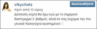 “Δύσκολη νύχτα θα έχω εγώ με το σημερινό διαστρεμμα 3′ βαθμού, αλλά σε σας εύχομαι την πιο γλυκιά! Καληνύχτα αγαπημένοι!” έγραψε η παρουσιάστρια στο λογαριασμό της στο Instagram.