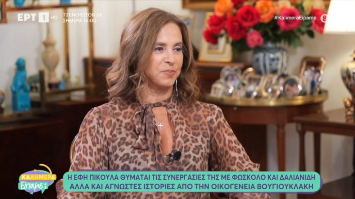 Η Έφη Πίκουλα μίλησε στην εκπομπή της ΕΡΤ1 «Καλημέρα είπαμε;» και στον δημοσιογράφο Κωνσταντίνο Αρκά, ανοίγοντας την καρδιά της για την προσωπική της ζωή, την απώλεια του συζύγου της Τάκη Βουγιουκλάκη, αλλά και για τις τελευταίες στιγμές της Αλίκης Βουγιουκλάκη.