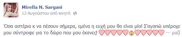 Μάλιστα, η πρώην παρουσιάστρια μοιράστηκε τη χαρμόσυνη είδηση με τους διαδικτυακούς της φίλους γράφοντας: “Όσα αστέρια και αν πέσουν σήμερα, εμένα η ευχή μου θα είναι μία! Σ΄αγαπώ, υπέροχέ μου σύντροφε, για το δώρο που μου έκανες!”