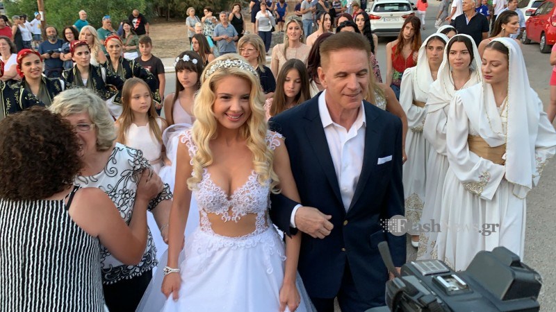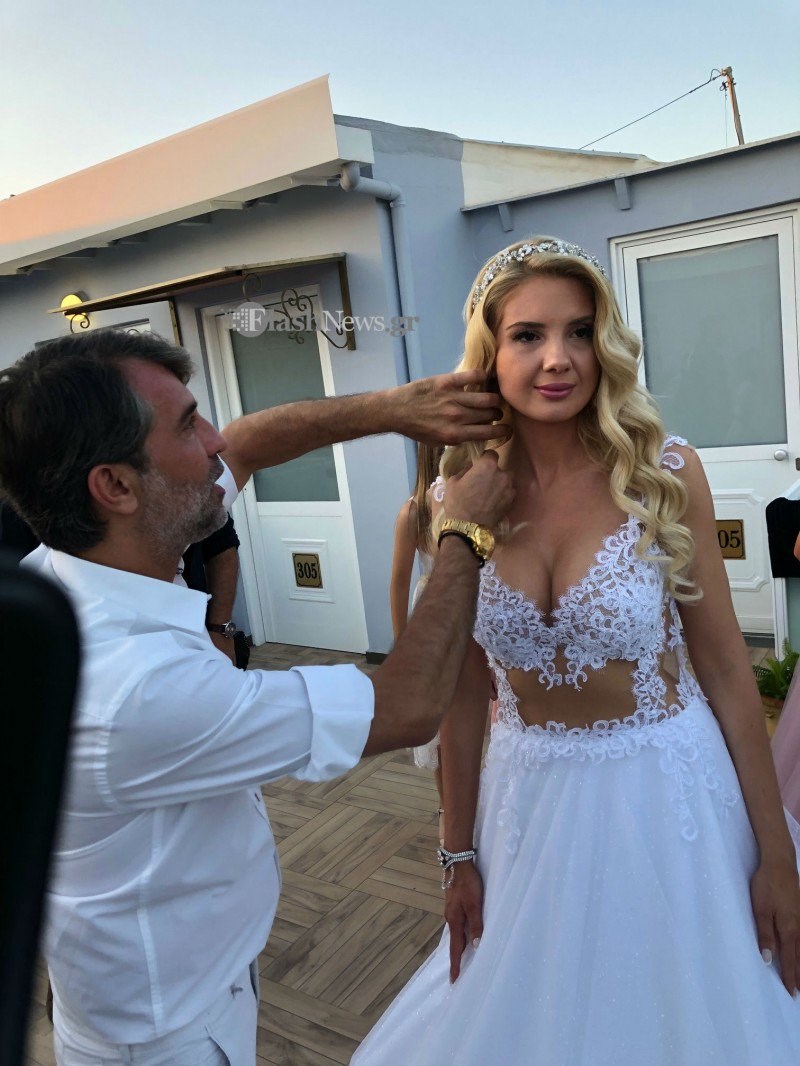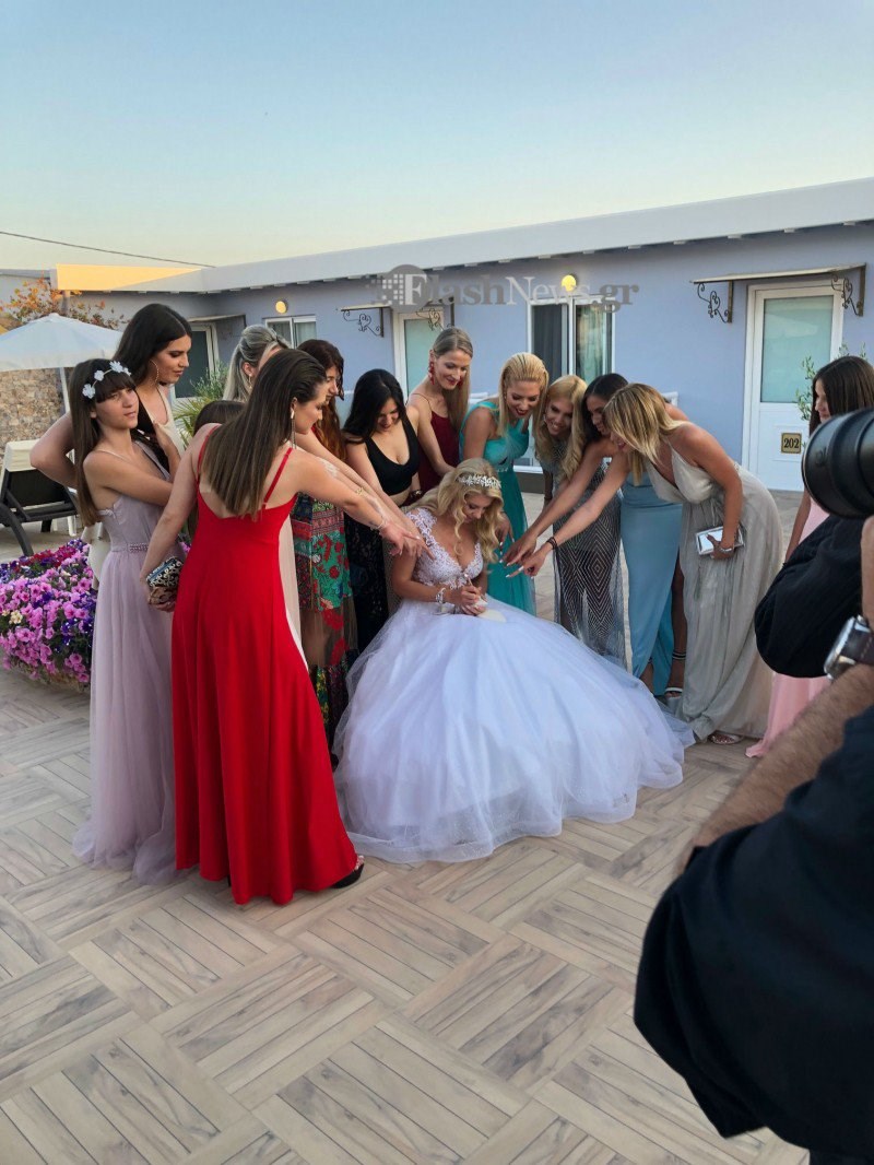 Πανέμορφη και εκθαμβωτική η νύφη Σοφία Μαριόλα φορούσε νυφικό του Βλάσση Χολέβα, με δαντέλα στο μπούστο, ανοιχτή πλάτη και έδινε την αίσθηση ότι γυαλίζει! Τα ξανθά μακριά μαλλιά της τα άφησε ελεύθερα ενώ έβαλε ένα διακριτικό αξεσουάρ.