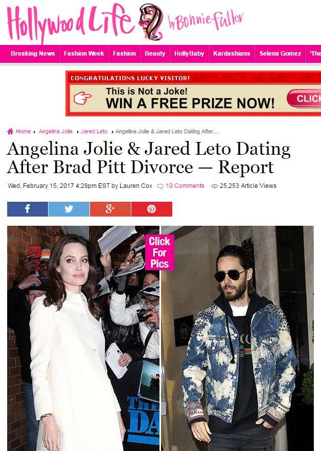 Σύμφωνα με δημοσίευμα του Hollywood Life, η Αντζελίνα Τζολί βγαίνει με τον Τζάρεντ Λέτο, με τον οποίο γνωρίζεται πολλά χρόνια, καθώς συμπρωταγωνιστούσαν στην ταινία «Alexander», το 2004.«Ο Τζάρεντ πλησίασε την Αντζελίνα λίγο αφότου εκείνη κατέθεσε την αίτηση διαζυγίου», αναφέρει το δημοσίευμα, και συνεχίζει «μετά από αρκετές φορές που μίλησαν στο τηλέφωνο, κανόνισαν να βγουν για δείπνο στο Λος Άντζελες και, έκτοτε, έχουν συναντηθεί αρκετές φορές».Μέχρι στιγμής, κανένας από τους δύο δεν έχει σχολιάσει το δημοσίευμα.