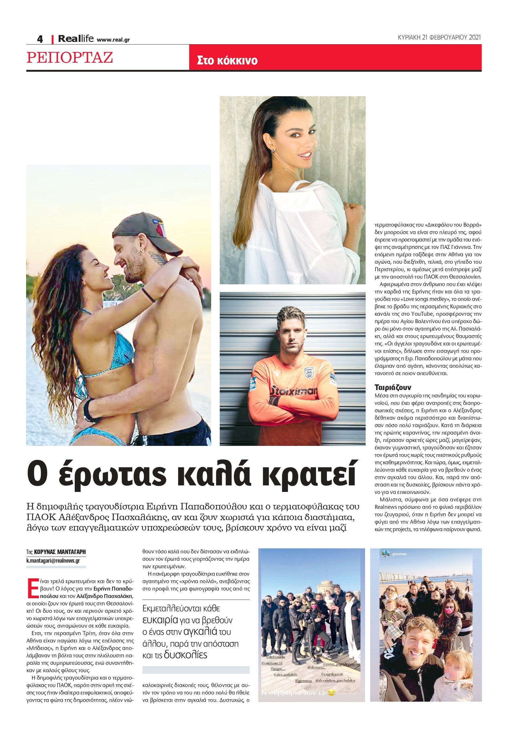 Η δημοφιλής τραγουδίστρια και ο τερματοφύλακας του ΠΑΟΚ, παρότι στην αρχή της σχέσης τους ήταν ιδιαίτερα επιφυλακτικοί, αποφεύγοντας τα φώτα της δημοσιότητας, πλέον νιώθουν τόσο καλά που δεν δίστασαν να εκδηλώσουν τον έρωτά τους γιορτάζοντας την ημέρα των ερωτευμένων.
