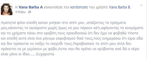 Μια περίεργη νύχτα έζησε η Βάνα Μπάρμπα καθώς όπως μας ενημέρωσε από το προφίλ της στο Facebook, άγνωστοι μπήκαν στο σπίτι της και δεν έκλεψαν απολύτως τίποτα, κάτι που την οδήγησε να κάνει λόγο για μήνυμα εκφοβισμού.