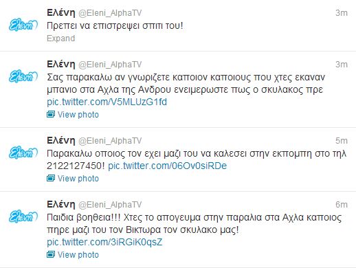 Έκκληση προς όσους βρέθηκαν χθες στα Άχλα Της Άνδρου απευθύνει η Ελένη Μενεγάκη μέσω του twitter, καθώς –όπως επισημαίνει- χάθηκε ο σκύλος της, ο Βίκτωρας.