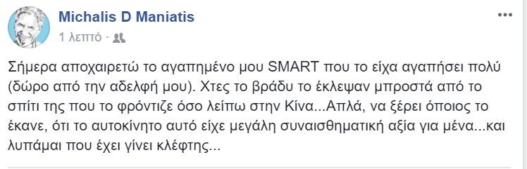 “Σήμερα αποχαιρετώ το αγαπημένο μου SMART που το είχα αγαπήσει πολύ (δώρο από την αδελφή μου). Χτες το βράδυ το έκλεψαν μπροστά από το σπίτι της που το φρόντιζε όσο λείπω στην Κίνα…Απλά, να ξέρει όποιος το έκανε, ότι το αυτοκίνητο αυτό είχε μεγάλη συναισθηματική αξία για μένα…και λυπάμαι που έχει γίνει κλέφτης…”.