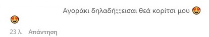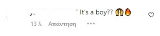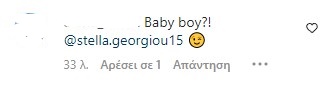 Το μπλε χρώμα στην εμφάνισή της, αλλά και τα όσα ανέφερε στην δημοσίευσή της, έκαναν μερικούς από τους διαδικτυακούς της φίλους να την ρωτήσουν με σχόλια τους στην ανάρτησή της αν το μωρό που θα αποκτήσει είναι αγοράκι.