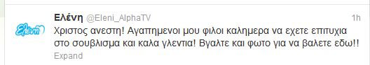 Η παρουσιάστρια του Alpha έγραψε στο twitter: “Χριστός Ανέστη! Αγαπημένοι μου φίλοι καλημέρα. Να έχετε επιτυχία στο σούβλισμα και καλά γλέντια! Βγάλτε και φωτό για να βάλετε εδώ!”