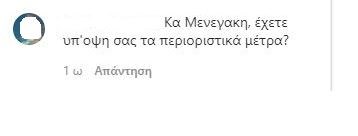 Κάποια από τα σχόλια που έγιναν κάτω από την ανάρτηση της Ελένης Μενεγάκη ήταν: “Πριν λίγο καιρό λέγατε στον κόσμο να ψωνίζει από τα μαγαζιά της γειτονίας τους. Τι έγινε δεν έχετε ψαράδικα στα Μελίσσια?”, “Κα Μενεγάκη, έχετε υπ’οψη σας τα περιοριστικά μέτρα”, “Να υποθέσω ότι πήγες με τα πόδια μέχρι εκεί!!!! Αλλά για κάποιους σαν και εσένα τα μέτρα δεν ισχύουν φυσικά!!! Σκέφτηκες ότι υπάρχουν οικογένειες που ούτε λαγάνα μπορούν να αγοράσουν με τα 534 ευρώ ενώ εσύ σουλατσάρεις και ψωνίζεις γαρίδες και διάφορα. Άντε μαζευτείτε λίγο”.