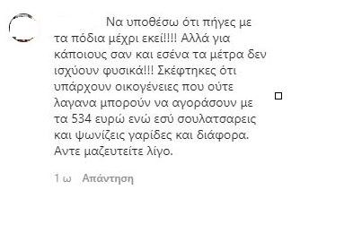 Η ανάρτηση φαίνεται ότι ενόχλησε πολλούς χρήστες του Instagram. Αρκετοί ήταν εκείνοι που έσπευσαν να σχολιάσουν το γεγονός ότι η γνωστή παρουσιάστρια δεν τήρησε τους περιορισμούς του lockdown καθώς πήγε για ψώνια σε περιοχή που βρίσκεται πολύ μακριά από το σπίτι της στα Μελίσσια.