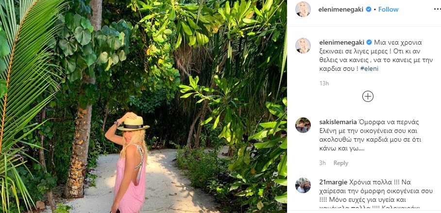 Από τον εξωτικό παράδεισο όπου βρίσκεται από τα Χριστούγεννα, η Ελένη Μενεγάκη κάνει αρκετές αναρτήσεις στον λογαριασμό της στο instagram, στις λευκές αμμουδιές και κάτω από τους φοίνικες.