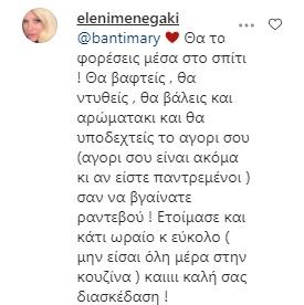 «Βγήκα και εγώ (για ψώνια) και δεν είχα μαζεμό! Χαλάλι να δω που θα τα φορέσω» ήταν το σχόλιο κάτω από την φωτογραφία της, με την Ελένη Μενεγάκη να της απαντά: