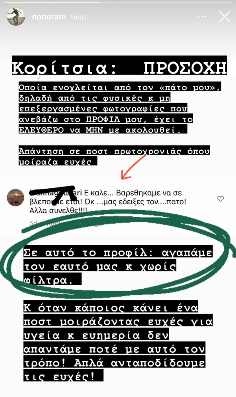 “Σε αυτό το προφίλ: αγαπάμε τον εαυτό μας και χωρία φίλτρα. Και όταν κάποιος κάνει ένα ποστ μοιράζοντας ευχές για υγεία και ευημερία δεν απαντάμε ποτέ με αυτό τον τρόπο! Απλά ανταποδίδουμε τις ευχές!”.