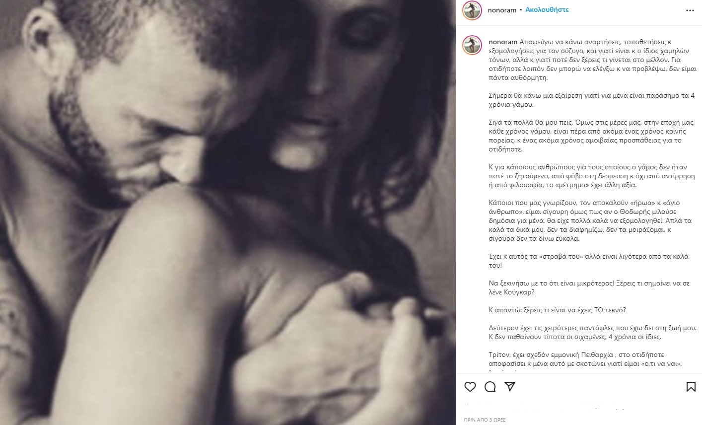 «Αποφεύγω να κάνω αναρτήσεις, τοποθετήσεις κ εξομολογήσεις για τον σύζυγο, και γιατί είναι κ ο ίδιος χαμηλών τόνων, αλλά κ γιατί ποτέ δεν ξέρεις τι γίνεται στο μέλλον. Για οτιδήποτε λοιπόν δεν μπορώ να ελέγξω κ να προβλέψω, δεν είμαι πάντα αυθόρμητη.