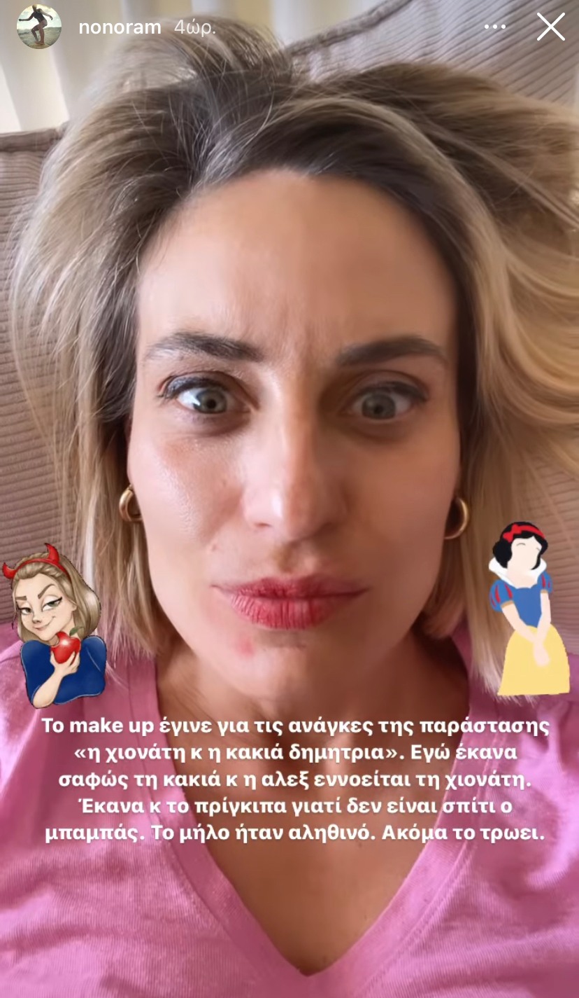 «Το make up έγινε για τις ανάγκες της παράστασης “η χιονάτη κ η κακιά δημητρια”. Εγώ έκανα σαφώς την κακιά και η Αλεξάνδρα εννοείται τη χιονάτη. Έκανα και τον πρίγκιπα, γιατί δεν είναι σπίτι ο μπαμπάς. Το μήλο ήταν αληθινό. Ακόμα το τρώει», έγραψε η Ελεονώρα Μελέτη σε μια από τις αναρτήσεις που έκανε.