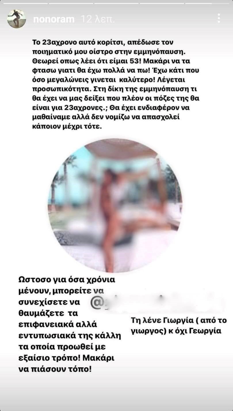 «Το 23χρονο αυτό κορίτσι απέδωσε τον ποιητικό μου οίστρο στην εμμηνόπαυση. Θεωρεί όπως λέει ότι είμαι 53 ετών! Μακάρι να τα φτάσω γιατί θα έχω πολλά να πω! Έχω κάτι που όσο μεγαλώνεις γίνεται καλύτερο! Λέγεται προσωπικότητα. Στη δική της εμμηνόπαυση τι θα έχει να μας δείξει που πλέον οι πόζες της θα είναι για 23χρονες;