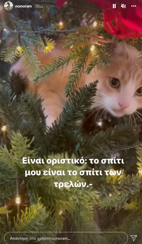 Επιπλέον, ιδιαίτερα αστείο στιγμιότυπο ήταν όταν είδε την γάτα της να ξεπροβάλει μέσα από το χριστουγεννιάτικο δέντρο. “Είναι οριστικό. Το σπίτι μου είναι το σπίτι των τρελών” έγραψε η Ελεονώρα Μελέτη.