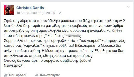 «Ζητώ συγνώμη από το συνάδελφο μουσικό που διέγραψα από φίλο πριν 2 λεπτά, αλλά δε μπορώ να είμαι φίλος με ομοφοβικούς που αναρτούν άρθρα υποστηρίζοντας ότι η ομοφυλοφιλία είναι αρρώστια ή ανωμαλία και δήθεν “που πάει η κοινωνία μας” και τέτοιες π@@@@@@ς», έγραψε ο Χρήστος Δάντης στη σελίδα του στο δημοφιλές μέσο κοινωνικής δικτύωσης.