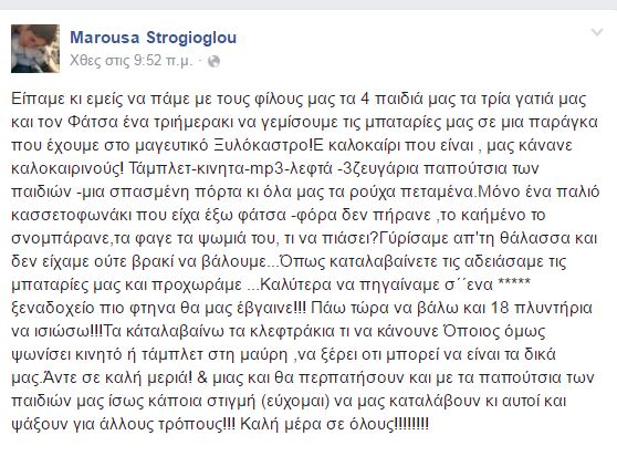 Όπως περιγράφει σε ανάρτησή της στο προσωπικό της προφίλ στο facebook, γύρισε από την παραλία μαζί με τον σύζυγό της και τα παιδιά τους και αντίκρισαν σπασμένη την πόρτα του σπιτιού τους, όλα τα ρούχα τους πεταμένα ενώ έλειπαν χρήματα, κινητά και ηλεκτρονικές συσκευές.
