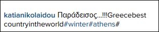 Η αλήθεια είναι ότι ακόμα δεν έχουμε νιώσει χειμώνα, ωστόσο, ελάχιστοι από μας θα μπορούσαν να κάνουν μπάνιο υπό τις παρούσες καιρικές συνθήκες. Στην εξαίρεση αυτή συμπεριλαμβάνεται η ηθοποιός Κάτια Νικολαϊδου, η οποία απόλαυσε το μπάνιο της και ανέβασε την παρακάτω φωτογραφία στο Instagram με το ακόλουθο σχόλιο: «Παράδεισος…!!!Ελλάδα, η ομορφότερη χώρα του κόσμου».