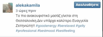 Ο λόγος για την Αλέκα Καμηλά που περνάει το Σαββατοκύριακό της στην συμπρωτεύουσα. Η παρουσιάστρια πήγε να κάνει μασάζ για να χαλαρώσει και ανέβασε μια φωτογραφία από τη στιγμή της απόλυτης χαλάρωσης στην προσωπική της σελίδα στο instagram, γράφοντας: «Το πιο ανακουφιστικό μασάζ γίνεται στη Θεσσαλονίκη. Δεν υπάρχει καλύτερο».