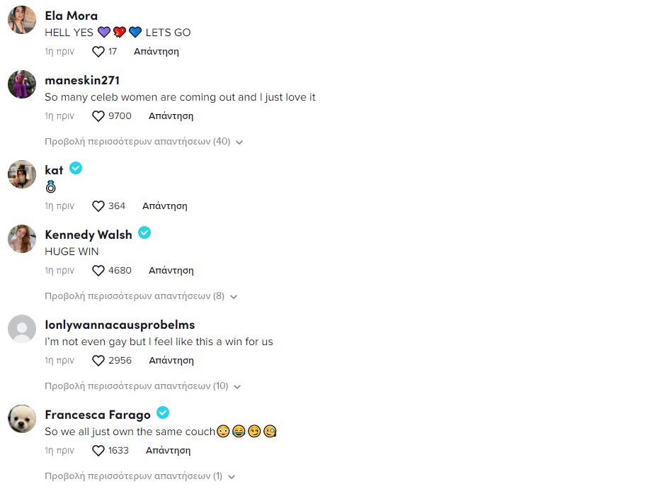 Ένας άλλος χρήστης έγραψε: «Τόσες πολλές διάσημες γυναίκες κάνουν επίσημα coming out και το λατρεύω».