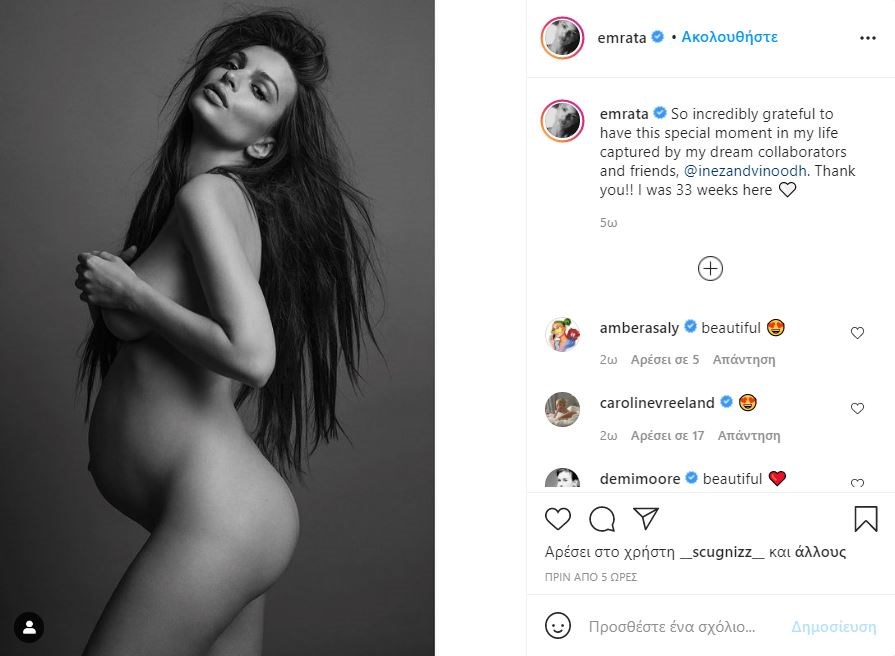 Το μοντέλο και επιχειρηματίας ανέβασε μία φωτογραφία της όπου ποζάρει ολόγυμνη άλλη μια φορά, αλλά αυτήν τη φορά επιδεικνύει την κοιλίτσα της ενώ ήδη διανύει την 33η εβδομάδα εγκυμοσύνης της. Η Έμιλι λάμπει από ευτυχία και ανυπομονησία να κρατήσει το πρώτο της παιδί στην αγκαλιά της. Παντρεύτηκε τον αγαπημένο της σε μια τελετή-έκπληξη στο δημαρχείο της Νέας Υόρκης και τώρα περιμένουν το πρώτο τους παιδί. Νωρίτερα την προηγούμενη εβδομάδα είχε πάλι αναρτήσει μία selfie της όπου πόζαρε ολόγυμνη στο μπάνιο της γράφοντας ότι άλλοτε αισθάνεται σαν τον Γουίνικι άλλοτε σαν θεά γονιμότητας.