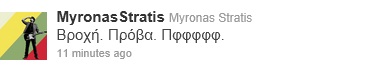 Η κακοκαιρία φαίνεται τους εμπνέει… Πρώτα τα χιόνια και τώρα οι βροχές! Η Σταματίνα Τσιμτσιλή, ως γνήσια ρεπόρτερ, μας έδωσε μια εικόνα για το τι συμβαίνει στην Κηφισίας αυτή την στιγμή εξαιτίας της βροχής: ”Η Κηφισίας θέλει κανό”.Κι ο Μύρωνας Στρατής όμως έγραψε: ”Βροχή. Πρόβα. Πφφφ”