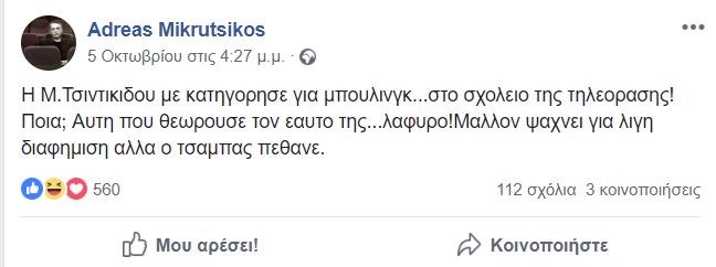 “Η Μ.Τσιντικιδου με κατηγόρησε για μπούλινγκ…στο σχολείο της τηλεόρασης! Ποια; Αυτή που θεωρούσε τον εαυτό της…λάφυρο! Μάλλον ψάχνει για λίγη διαφήμιση αλλά ο τσάμπας πέθανε”, είχε γράψει στο Facebook, ο Ανδρέας Μικρούτσικος.