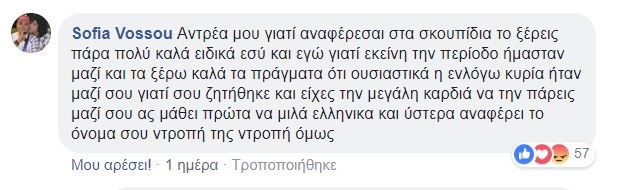 Η πρώην σύζυγος του Ανδρέα Μικρούτσικου, Σοφία Βόσσου, θέλησε να πάρει θέση και να τον υπερασπιστεί, γράφοντας ένα σχόλιο, κάτω από την ανάρτηση του παρουσιαστή.