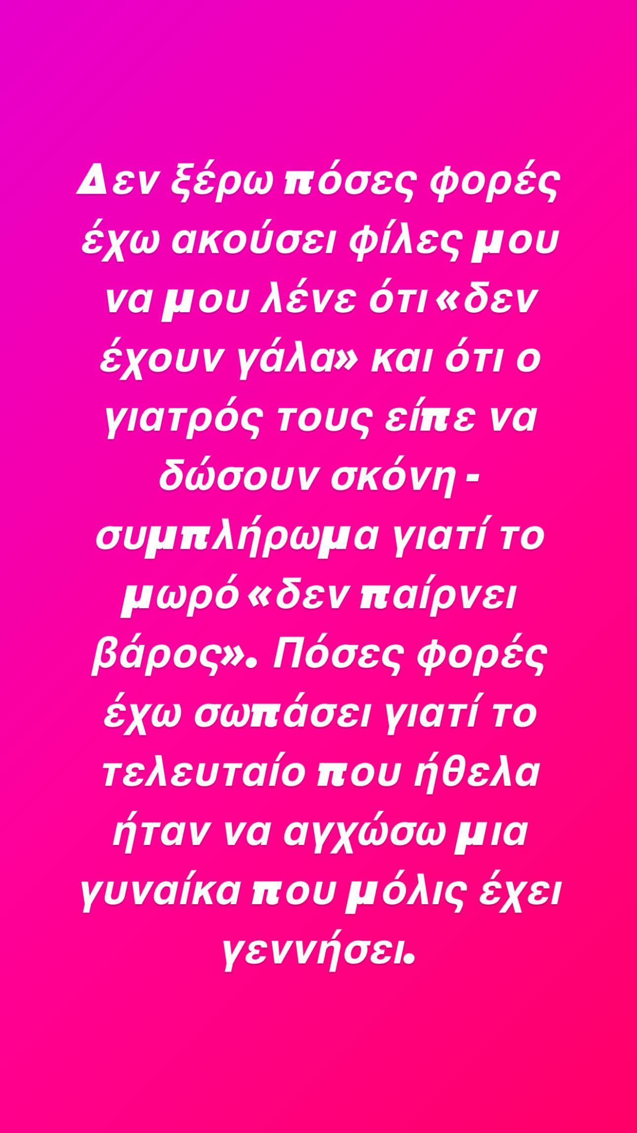 Πριν από λίγη ώρα ανέβασε τρία κείμενα με την μορφή του story στα οποία μιλάει για τον θηλασμό. Συγκεκριμένα γράφει: «Δεν ξέρω πόσες φορές έχω ακούσει φίλες μου ότι «δεν έχουν γάλα» και ότι ο γιατρός τους είπε να δώσουν σκόνη- συμπλήρωμα γιατί το μωρό «δεν παίρνει βάρος». Πόσες φορές έχω σωπάσει γιατί το τελευταίο που ήθελα ήταν να αγχώσω μια γυναίκα που μόλις έχει γεννήσει.
