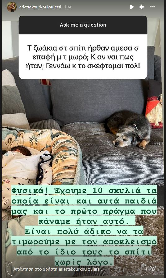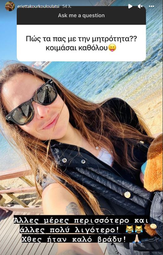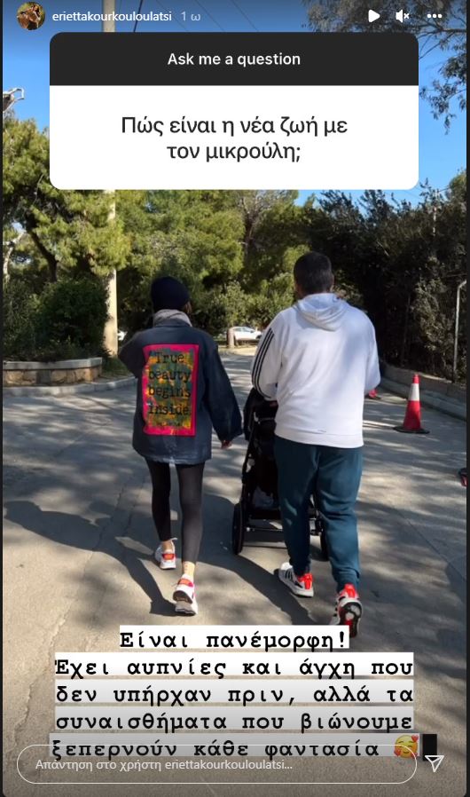 «Πώς είναι η ζωή με τον μικρούλη», ήταν η ερώτηση που δέχτηκε η Εριέττα Κούρκουλου με εκείνη να απαντά: «Είναι πανέμορφη. Έχει αυπνίες και άγχη που δεν υπήρχαν πριν, αλλά τα συναισθήματα που βιώνουμε ξεπερνούν κάθε φαντασία».