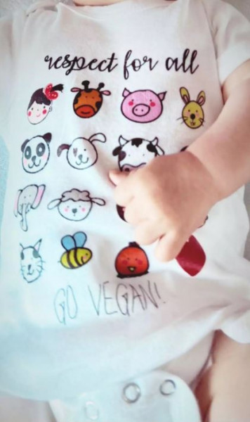 Το απόγευμα της Τετάρτης έκανε μια εξαίρεση και δημοσίευσε μία φωτογραφία στον προσωπικό της λογαριασμό στο Instagram με το νεογέννητο, δείχνοντας το ιδιαίτερο φορμάκι που έχει επιλέξει για εκείνον με ζωάκια. «Σας σέβομαι όλους. Γίνε Vegan» έγραφε το βρεφικό φορμάκι.