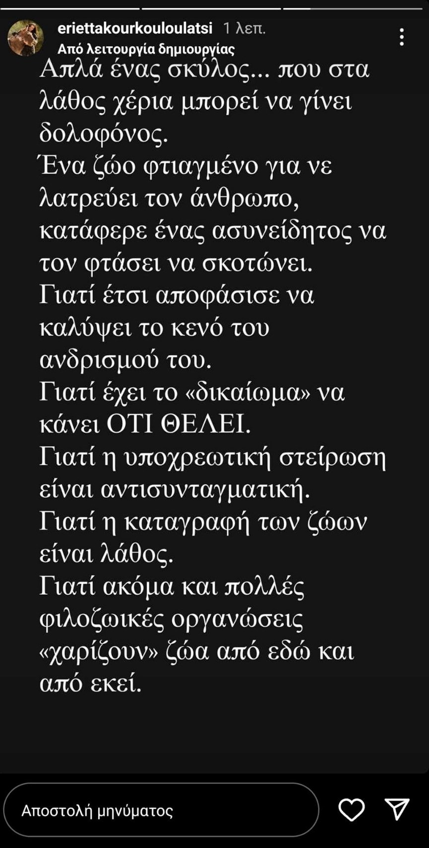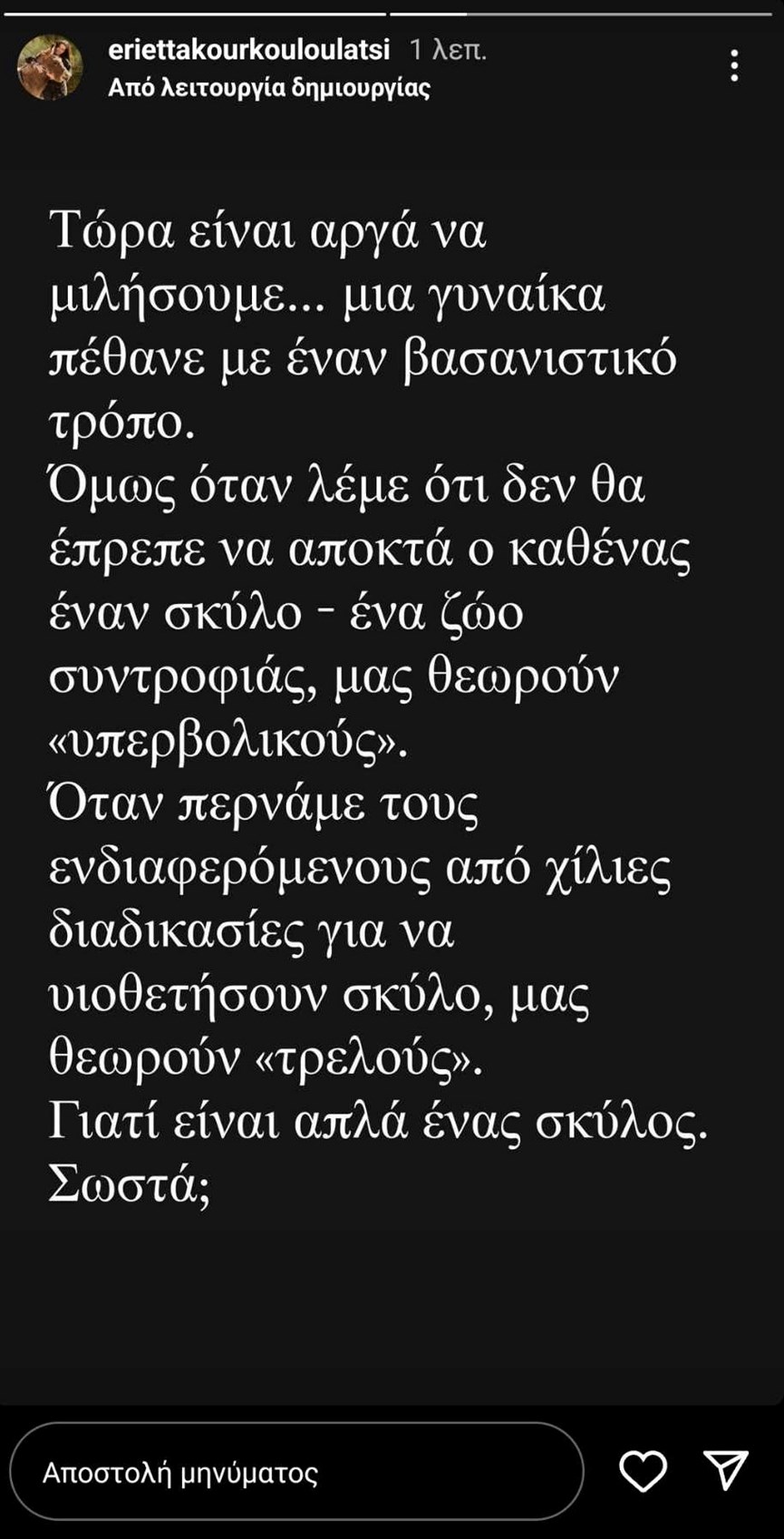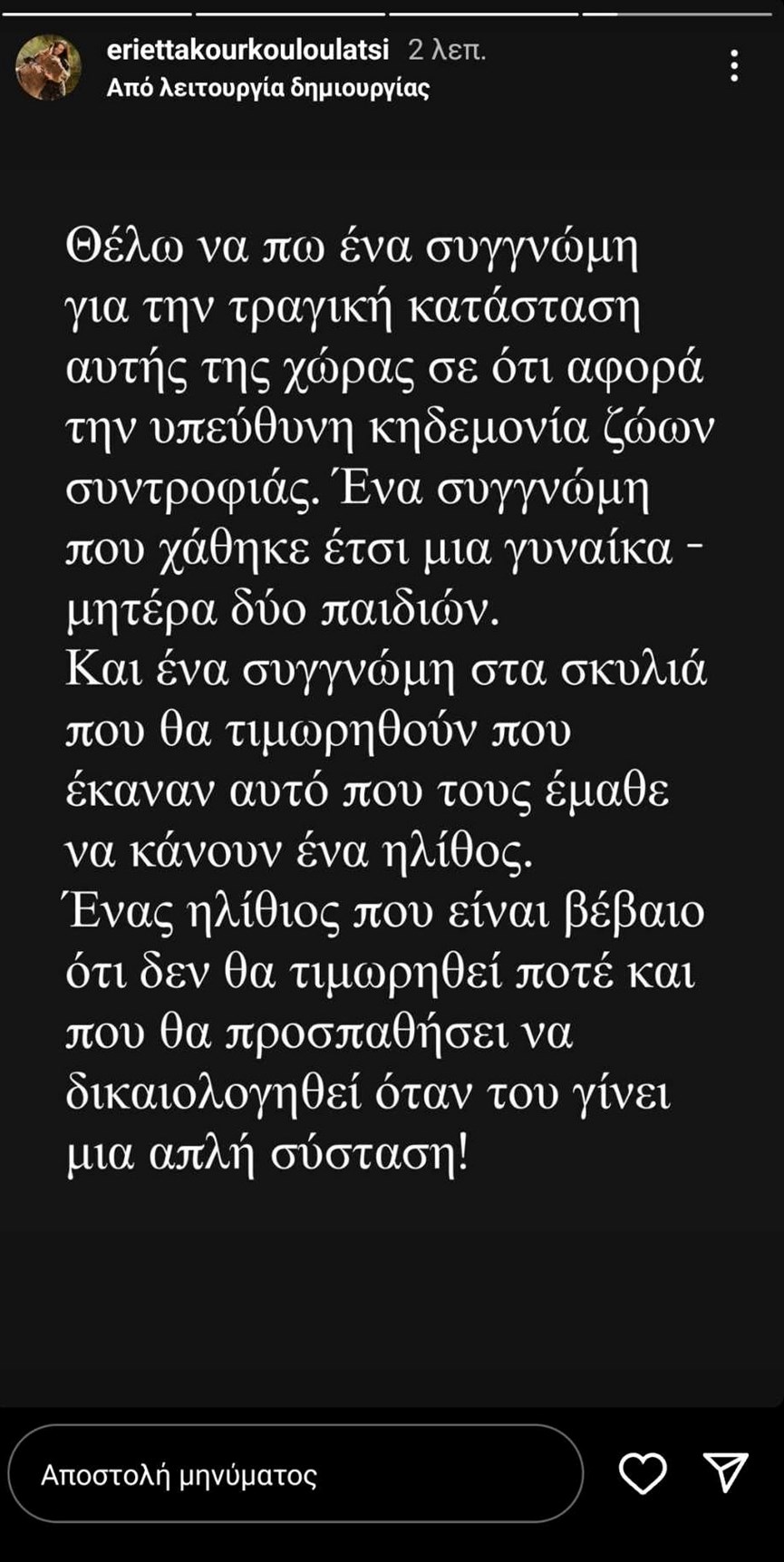 Θέλω να πω συγγνώμη για την τραγική κατάσταση αυτής της χώρας σε ό, τι αφορά την υπεύθυνη κηδεμονία ζώων συντροφιάς. Συγγνώμη που χάθηκε έτσι μια γυναίκα – μητέρα δύο παιδιών. Ένα συγγνώμη στα σκυλιά που θα τιμωρηθούν που έκαναν αυτό που τους έμαθε να κάνουν ένας ηλίθιος. Ένας ηλίθιος που είναι βέβαιο ότι δεν θα τιμωρηθεί ποτέ που και που θα προσπαθήσει να δικαιολογηθεί όταν του γίνει μια απλή σύσταση», έγραψε η Εριέττα Κούρκουλου.