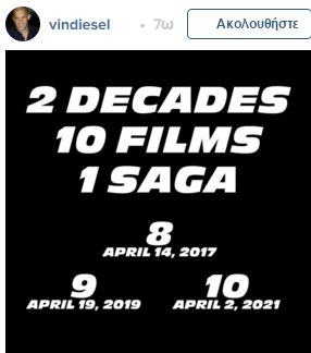 Παράλληλα, ο Βιν Ντίζελ μέσω Instagram ενημέρωσε τους θαυμαστές του ότι το Fast and Furious 9 θα έρθει στις κινηματογραφικές αίθουσες στις 19 Απριλίου 2019 και το Fast and Furious 10 στις 2 Απριλίου 2021.