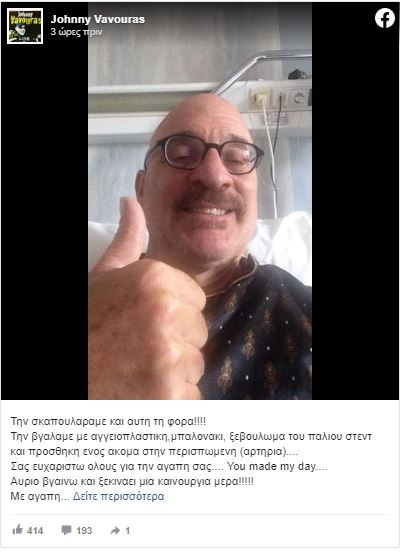 Το πρωί της Τετάρτης θέλησε να καθησυχάσει τους διαδικτυακούς του φίλους που ανησύχησαν για την κατάσταση της υγείας του συμπληρώνοντας: «Τη σκαπουλάραμε και αυτή τη φορά!!!! Την βγάλαμε με αγγειοπλαστική,μπαλονάκι, ξεβούλωμα του παλιού στεντ και προσθήκη ενός ακόμα στην περισπωμένη (αρτηρία)…. Σας ευχαριστώ όλους για την αγάπη σας…. You made my day…. Αύριο βγαίνω και ξεκινάει μια καινούργια μέρα!!!!! Με αγάπη Vavourobocop !!!!».