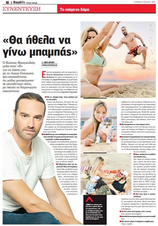 Έχοντας αναρρώσει από τον κορονοϊό, ο Κώστας Φραγκολιάς αποκαλύπτει στη Realife ότι μόλις μετακόμισαν με τη σύντροφό του, Δώρα Πατσιώτη, σε μεγαλύτερο σπίτι, καθώς, όπως εκμυστηρεύεται, είναι έτοιμοι να κάνουν οικογένεια. Περιγράφει πώς γνώρισε την αγαπημένη του πριν από μια 20ετία και μιλά για το «Happy Day» του Alpha και την παιδική του γειτόνισσα, Σταματίνα Τσιμτσιλή.