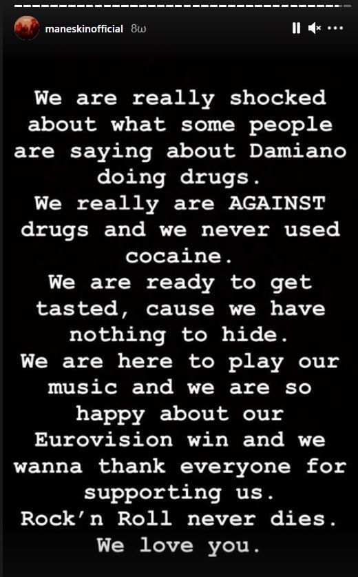 “Γνωρίζουμε σχετικά με τις εικασίες που υπάρχουν για το πλάνο των Ιταλών νικητών του διαγωνισμού της Eurovision στο Πράσινο Δωμάτιο χθες το βράδυ. Το συγκρότημα αρνήθηκε κατηγορηματικά τους ισχυρισμούς για χρήση ναρκωτικών και ο εν λόγω τραγουδιστής θα υποβληθεί εθελοντικά σε τοξικολογικές εξετάσεις, όταν επιστρέψει στην πατρίδα του. Αυτό το ζήτησαν οι ίδιοι χθες το βράδυ, αλλά δεν γινόταν να οργανωθεί αμέσως από την EBU”.