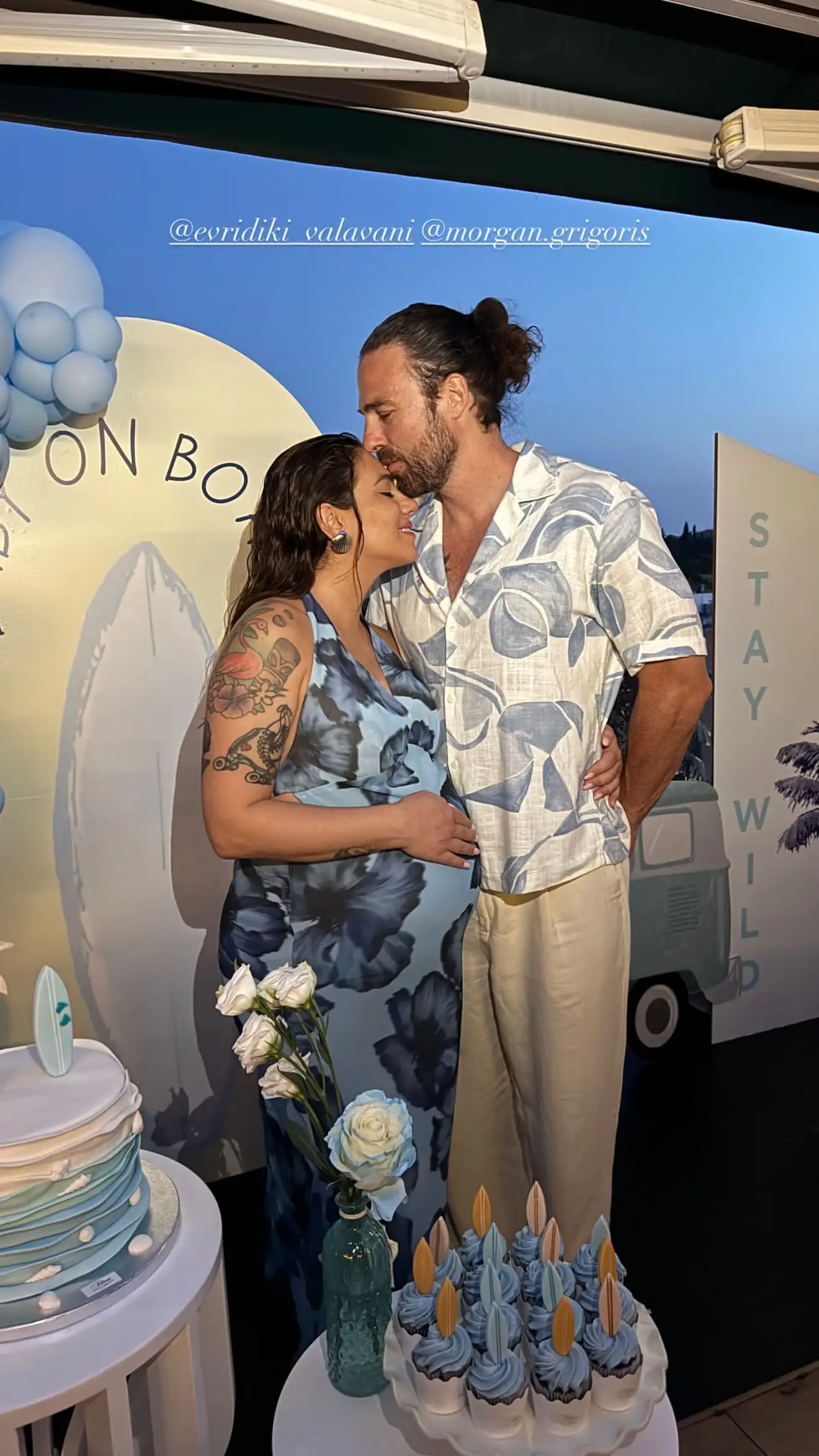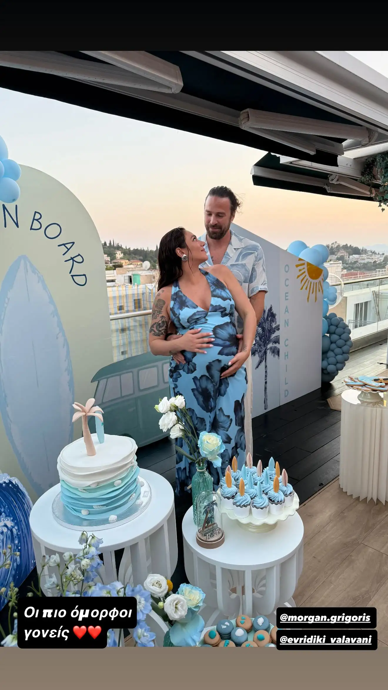 Το απόγευμα της Κυριακής 15 Ιουνίου, οι μελλοντικοί γονείς διοργάνωσαν ένα τρυφερό baby shower για τους στενούς τους φίλους. Η διακόσμηση κινήθηκε σε αποχρώσεις του μπλε και του λευκού, ενώ κυριάρχησαν προσωπικές πινελιές, όπως σανίδες του σερφ και ένα campervan, στοιχεία που αποκαλύπτουν το πάθος του ζευγαριού για την περιπέτεια και τη φύση.